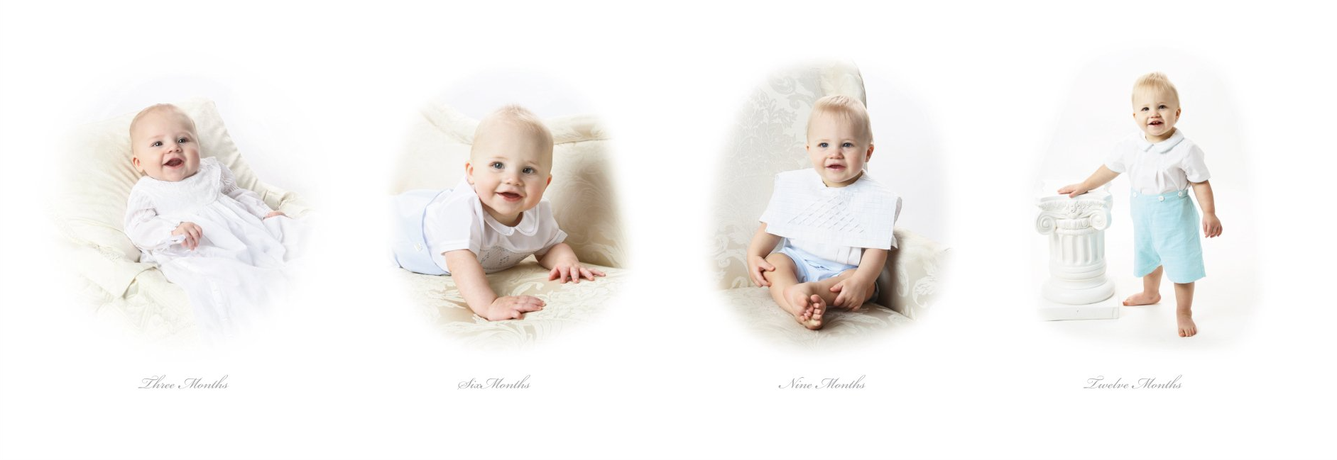 Heirloom Baby Panels are a beloved Southern tradition that beautifully document your baby’s growth at 3, 6, 9, and 12 months. These custom portrait panels show the progression of your baby’s first year in black and white, color, or hand-tinted oils. Each panel is a timeless piece of art, carefully composed to reflect each stage of your child’s development.